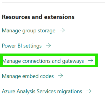 - In your Power BI Fabric, go to Settings option and Select "Manage connections and gateways":