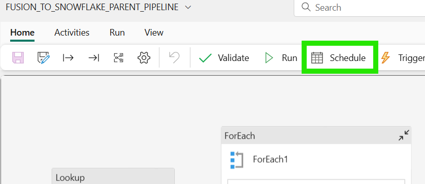 - Open your main pipeline (FUSION_TO_SNOWFLAKE_PARENT_PIPELINE )